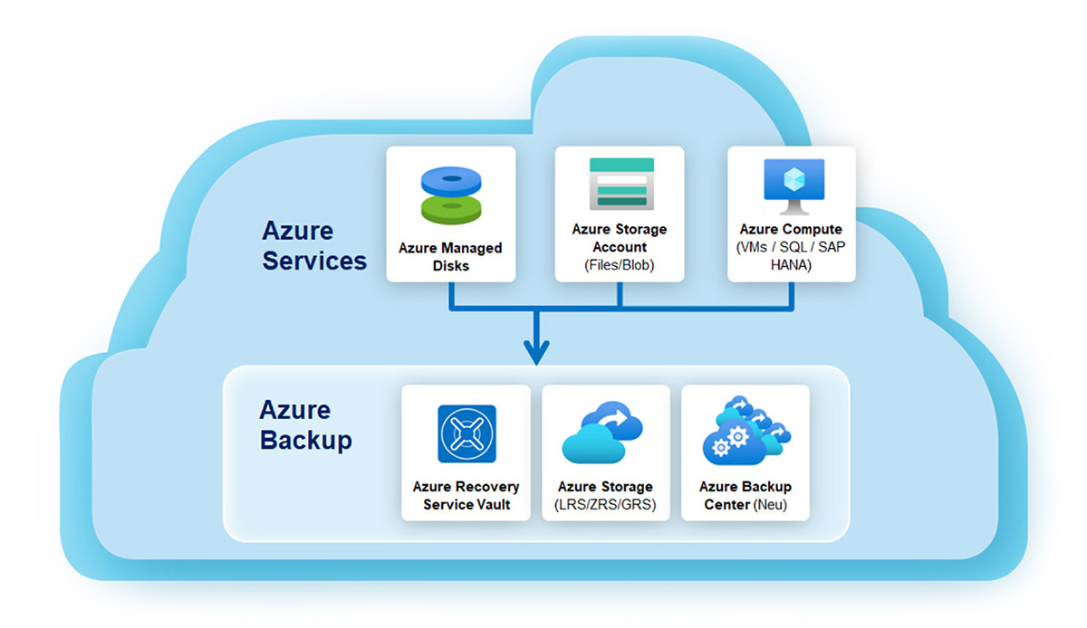 Das “Azure Recovery Service Vault” verwaltet zentral Backups in einer Region und nutzt “Azure Storage”, welcher von Microsoft verwaltet wird. Zur Auswahl stehen lokal redundanter Speicher (LRS), zonenredundanter Speicher (ZRS) und georedundanter Speicher (GRS). Das “Azure Backup Center” dient zur übergreifenden Verwaltung von mehreren Azure Recovery Service Vaults.